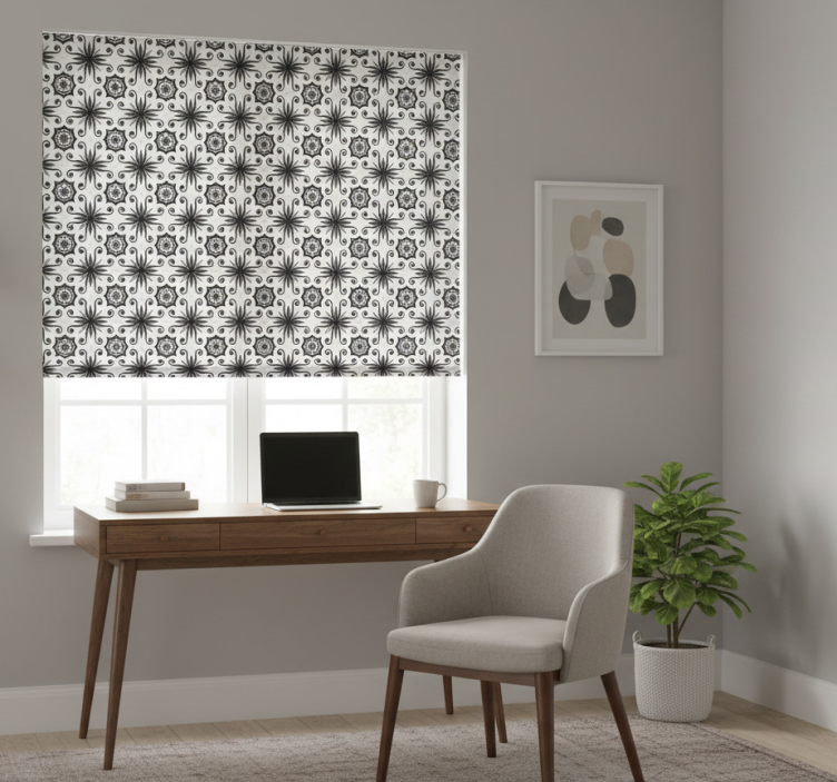一幅详细的作品,展示了重叠的黑白花卉图案、交错的涡旋和几何形状。这些图案形成了节奏感的流动,以动态的排列增强了视觉趣味。每个元素都增添了深度,以其复杂的设计和统一的结构吸引了注意力。