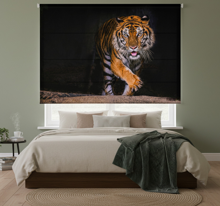 一只令人惊叹的老虎自信地迈步,展现出它引人注目的条纹和强大的气场。动物迷人的目光突显了它的凶猛气质,背景则增强了整体的戏剧感。它鲜艳的颜色和复杂的图案强调了这只非凡生物的自然美。