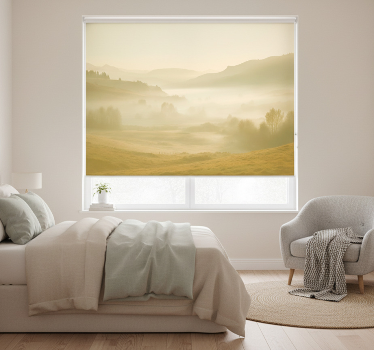 一幅宁静的风景展现在眼前,柔和的山丘被轻柔的雾气包围。远处的山脉和从雾中显现的细腻树木描绘出一种宁静的氛围。淡金色的光辉增强了景色的平和感,邀请人们沉思和放松。