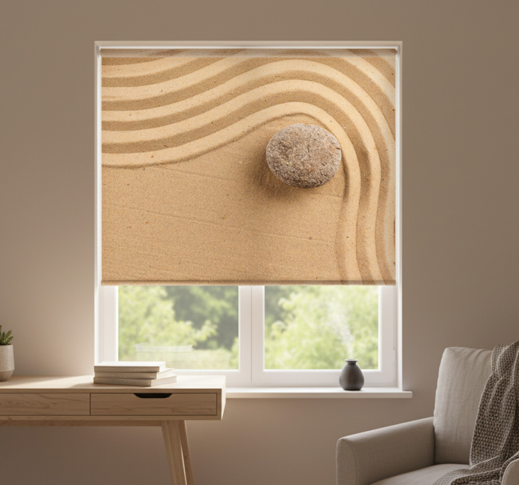 一个艺术性的排列展现了沙质景观中的柔和曲线和涟漪,辅以一块孤独的石头,为整体增添了一丝自然的优雅。该设计强调宁静和简约,和谐的纹理融合唤起了一种宁静的户外氛围。