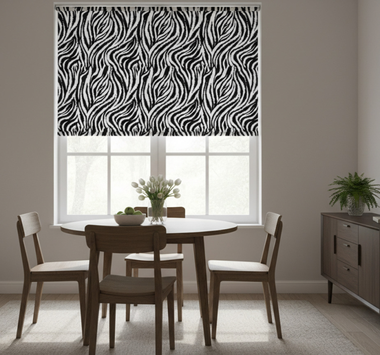 将dining room roller blind 饭厅盲道经典不规则黑白斑马图案安装在您的餐厅窗户上,您将发现它的美观与实用性相得益彰。您可以根据光线的变化,轻松调节室内温度,让阳光恰到好处地洒入您的空间,创造出理想的用餐环境。