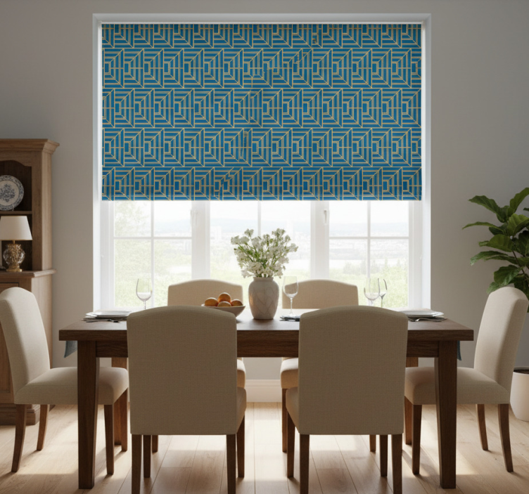 使用这款dining room roller blind饭厅盲道金色线条蓝色背景,您可以轻松调节光线和隐私。它不仅适合窗户使用,也可以作为空间划分的利器,为您的家居增添层次感。