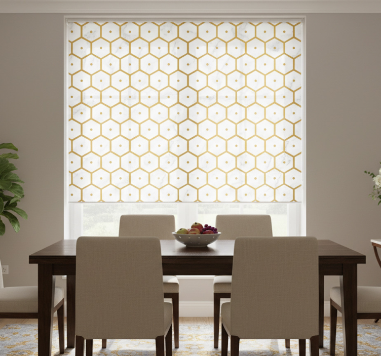 一个令人惊叹的设计,采用金色的蜂窝图案,搭配白色和大理石的点缀。六边形形状经过精心排列,间隔着细致的金色点,创造出引人注目的效果,为任何空间增添了一丝优雅和魅力。