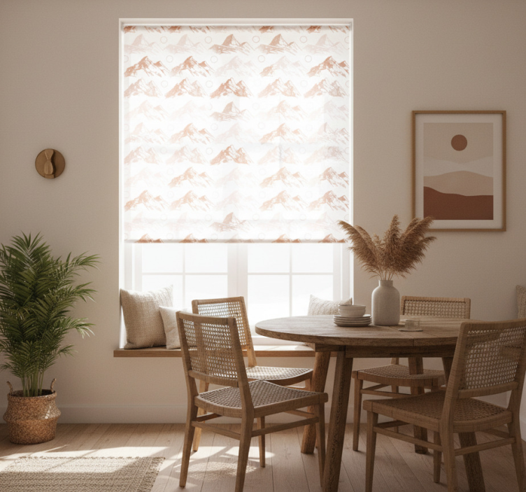 将这款dining room roller blind 饭厅盲道呈现陶土山脉图案悬挂在您的饭厅窗户上,不仅可以有效阻挡阳光直射,还能为空间增添一抹独特的艺术气息。您可以根据自己的需求和喜好,选择适合的光线和隐私等级,轻松调节室内氛围。