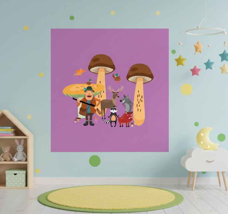 这幅生动的插图描绘了一个奇幻的森林场景,展示了一位快乐的猎人,周围环绕着各种林间动物,包括一只鹿、一只浣熊和一只狐狸。高耸的蘑菇在背景中显得格外突出,而五彩斑斓的鸟儿在空中翩翩起舞,为这个充满趣味和想象力的氛围增添了色彩。