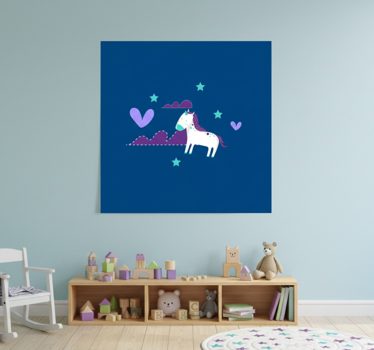 这幅迷人的插图描绘了一只奇幻的白色独角兽,站在深蓝色的背景前。围绕着这个神奇的生物的是风格化的云朵、五彩斑斓的心形和星星,营造出一种迷人的氛围。这个俏皮的设计采用了柔和的紫色和青色,使其成为儿童房间的理想装饰品。
