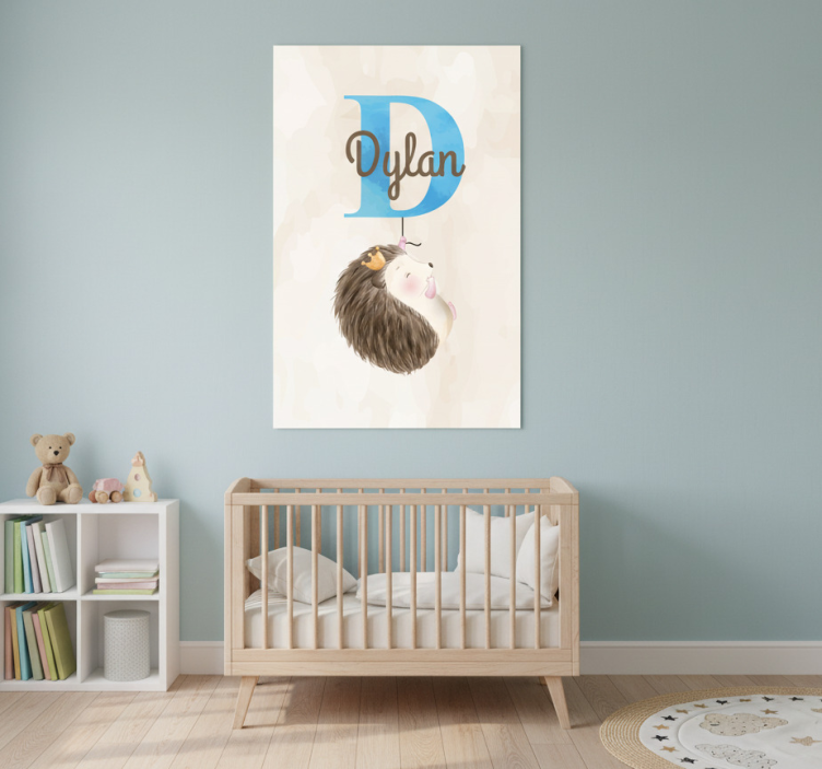 这幅图像展示了一幅迷人的幼儿园插图,描绘了一只顽皮的刺猬悬挂在蓝色字母'D'上。下面,名字'Dylan'以优雅的字体书写。这个可爱的设计背景是柔和的米色,带来温暖和快乐,非常适合儿童房间的装饰。