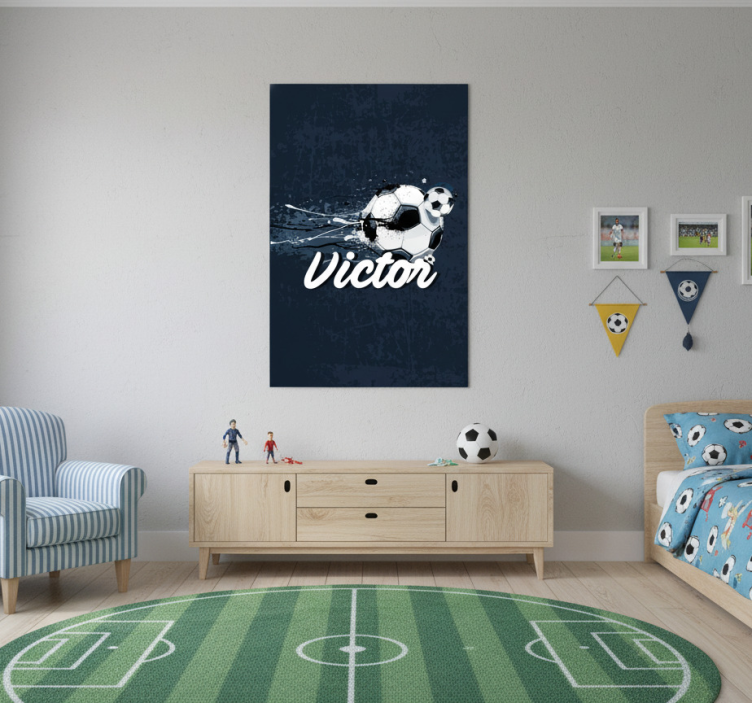 这幅生动的艺术作品展示了动态的足球元素,展现了一只流线型的足球在运动中,以及名称 'Victor'。大胆的设计与深色的纹理背景形成对比,增添了现代感。非常适合运动爱好者,这件作品提升了任何房间的氛围。