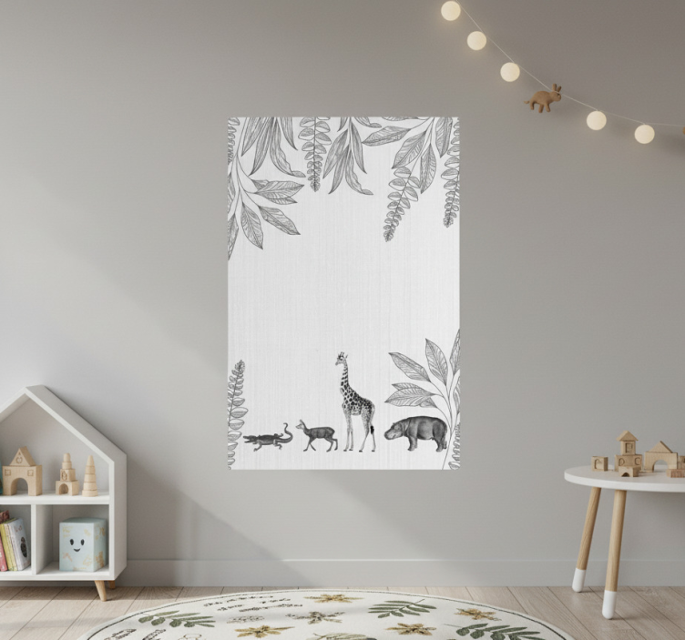 这幅图像展示了一幅单色艺术作品,描绘了一场奇幻的动物游行,包括一只长颈鹿、一只猫和一只熊,背景则是装饰有植物叶子的细腻图案。这样的排列营造出一种和谐美好的氛围,非常适合儿童空间或野生动物主题的装饰。
