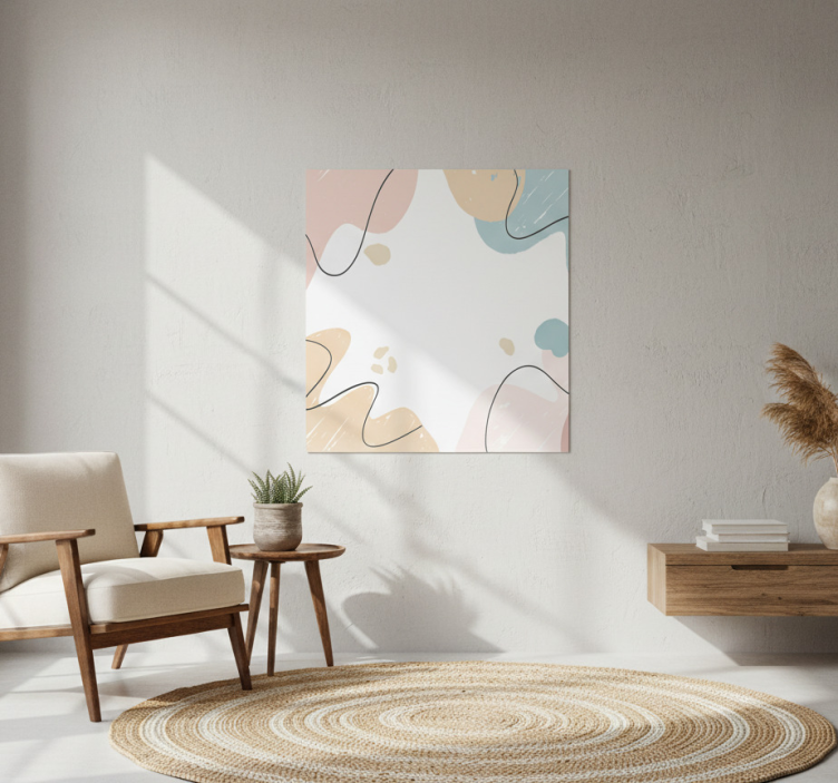 这幅图展示了一个现代的生活空间,采用简约设计。一个时尚的椅子摆放在一张装饰着盆栽植物的木桌旁。一个有质感的圆形地毯与装饰相得益彰。墙上的艺术作品展示了奇幻的柔和色彩形状,曲线和柔和的色调增强了宁静的氛围,营造出温馨的环境。
