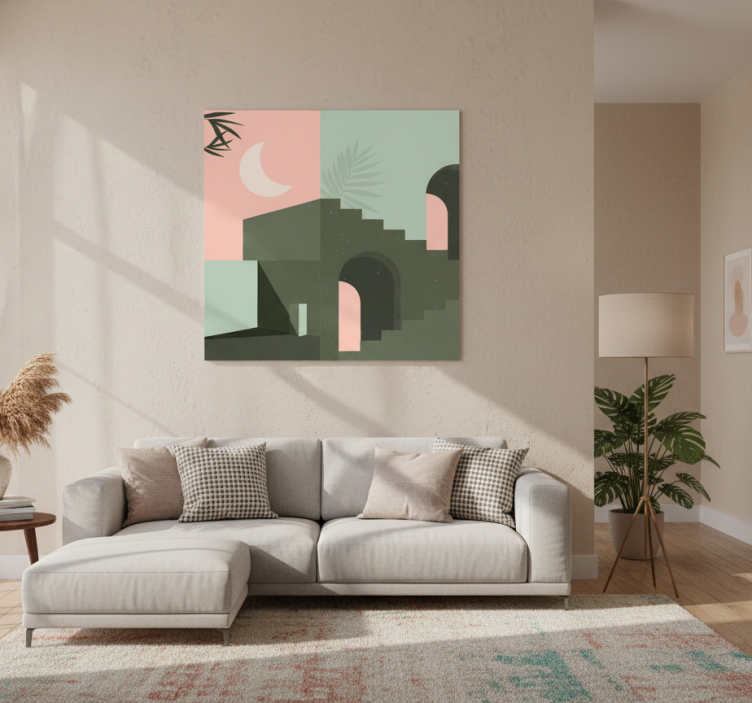这幅现代艺术作品以宁静的柔和色彩展示了几何形状。拱门和楼梯结构以柔和的绿色和对比鲜明的粉色描绘而成。弯月和植物元素增添了深度,营造出宁静的氛围。非常适合现代装饰,这件作品唤起了一种平静和艺术灵感。