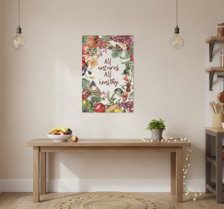 一个迷人的厨房场景展示了一面装饰着艺术海报的墙,海报上绘有生动的水果和蔬菜。信息强调自然健康。一张木桌上摆放着新鲜的农产品,柔和的自然光照亮了整个空间,营造出一个温暖而宜人的健康生活氛围。