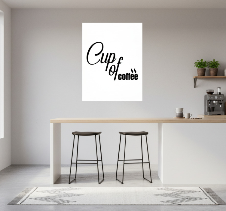 这幅图展示了一个极简主义的厨房内部,特色是一件时尚的艺术作品,上面写着'Cup of coffee'。设计采用优雅的排版,增强了宁静的氛围。两个时尚的吧椅摆放在木质台面旁,搭配盆栽绿植,营造出一种温馨而现代的氛围。