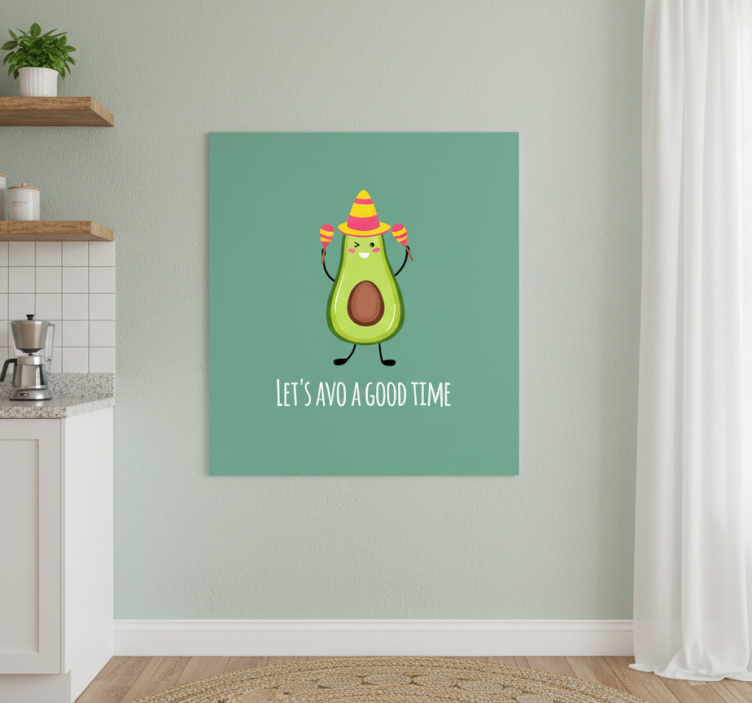这幅生动的艺术作品展示了一个穿着五彩帽子的快乐鳄梨角色。这个充满趣味的设计散发着欢乐,搭配着短语 'LET'S AVO A GOOD TIME'。背景是宁静的绿色,这幅插图非常适合厨房装饰,营造出一种有趣而活泼的氛围。