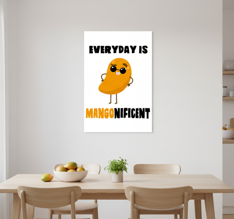 这幅富有趣味的插图展示了一个戴着太阳镜的快乐芒果角色。俏皮的标语 'Everyday is MANGOnificent' 增添了它的魅力。背景简约,果实和字体的鲜艳色彩营造出一种愉悦的氛围,完美适合点亮空间或为装饰增添趣味。
