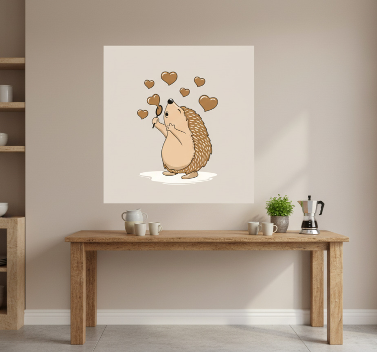 这幅异想天开的插图描绘了一只可爱的刺猬,手里拿着一个顽皮的配饰,周围环绕着漂浮的心形图案。这个迷人的角色散发出温暖和亲切,完美体现了适合各种装饰场合的顽皮主题。柔和的色彩和简单的设计增强了其吸引力,使任何居住空间更加宜人。