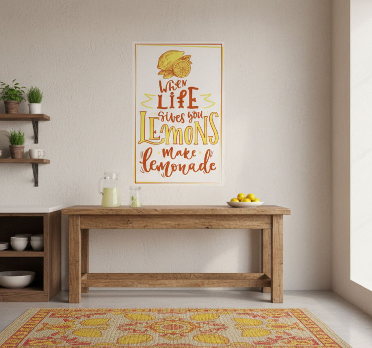 这幅图像展示了一件鼓舞人心的墙面艺术作品,上面写着‘When life gives you lemons, make lemonade.’ 这个充满活力的设计融入了柠檬插图,强调了积极与韧性。下面的乡村风格木桌上摆放着一碗柠檬,衬托出房间的愉悦装饰和温馨氛围。