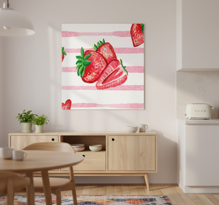 这幅生动的图像展示了一组令人愉悦的草莓,背景是俏皮的粉色条纹。这些成熟的红色水果被艺术性地描绘,展现出丰盈的绿色叶子和多汁的质感。这种欢快的设计为任何空间增添了清新的气息,非常适合提升厨房或餐厅的氛围。