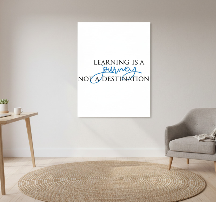 这幅图像展示了一个极简的室内环境,墙上挂着一幅画布,上面写着激励人心的文字。文本强调了成长是一个持续的旅程,而不仅仅是一个目标。优雅的蓝色草写字体与干净的白色背景形成鲜明对比,照亮了空间,激发了自我反思。