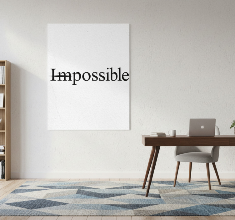 这幅图展示了一个极简主义的工作空间,墙上挂着一幅醒目的海报,上面写着'Impossible'。背景主要是白色的,增强了信息的影响力。一个时尚的木桌配上现代椅子,以及整齐摆放的装饰,完美地营造出一个激发创造力和生产力的鼓舞人心的氛围。