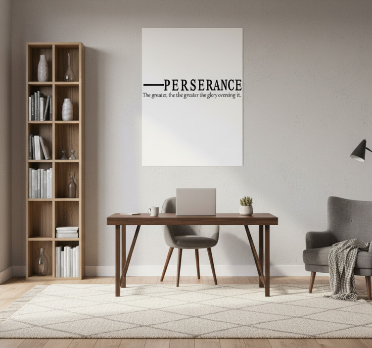 这个现代化的工作空间配有一张时尚的木桌和一把舒适的椅子。一个极简风格的架子上陈列着装饰品和书籍。一句关于 perseverance 的鼓舞人心的名言装饰在墙上,激励人心。柔和的灯光增强了舒适的氛围,而一块有质感的地毯为这个温馨的环境增添了温暖。