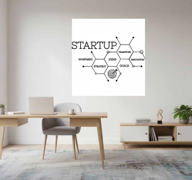 这幅图描绘了一个现代工作空间,采用简约的桌面布置。一个笔记本电脑放在一个小盆栽和一杯咖啡旁边。墙上有一幅图形,展示了创业文化的关键概念,包括团队合作、投资、战略、创意和创新,视觉上有序排列,以激发创造力。