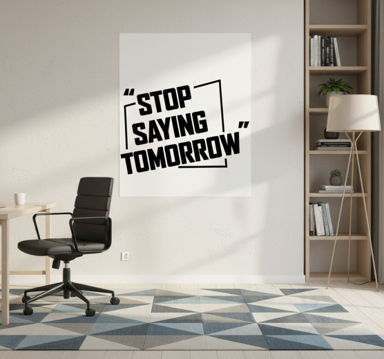 这个现代化的工作空间配备了一张时尚的黑色椅子,放置在极简风格的桌子旁。一个激励人心的海报大胆地写着,'STOP SAYING TOMORROW',鼓励积极主动的行为。这个光线充足的房间配有几何图案的地毯,书架上展示着书籍和绿色植物,营造出一个鼓舞人心且温馨的氛围。