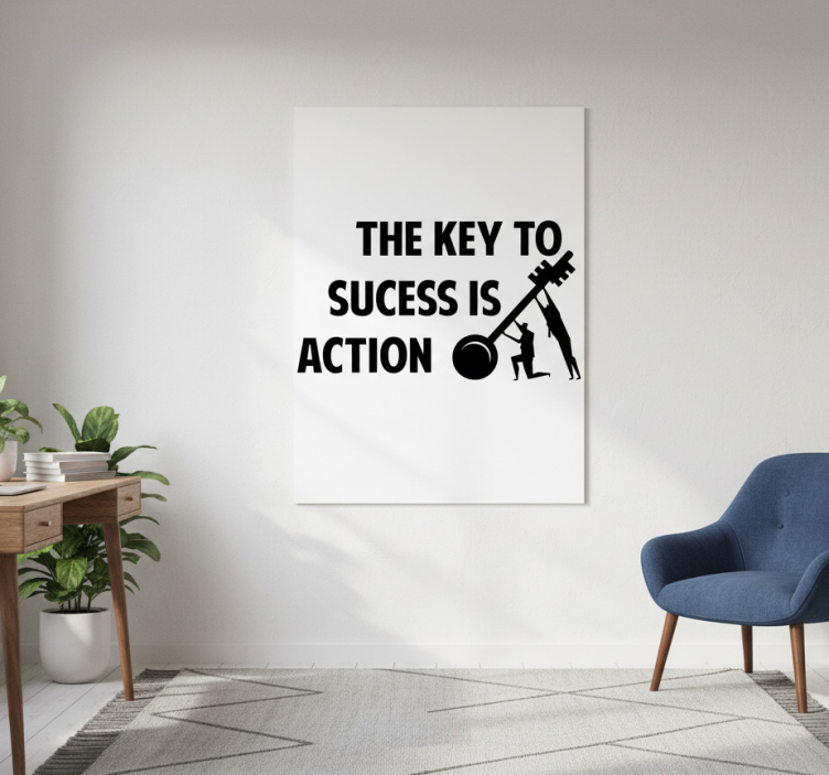 这幅图像展示了一件激励人心的墙面艺术作品,主题是“The Key to Success is Action”。设计中融合了强烈、粗体的排版,以及象征努力和决心的图形元素。背景简洁、极简,这件鼓舞人心的装饰旨在激励个人或职业环境中的行动和坚持不懈。