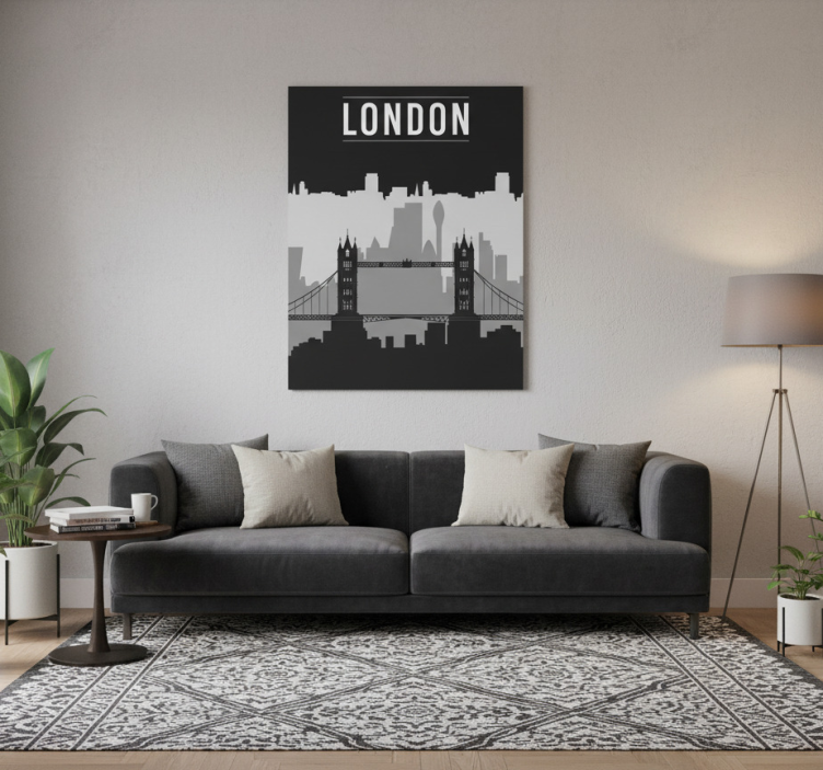 这件艺术作品展示了标志性的伦敦天际线,突出了著名的 Tower Bridge。简约的设计采用了灰度调色板,增强了现代城市美学。下面,一张时尚的沙发与装饰相得益彰,而一盆植物则增添了一丝绿意,为任何居住空间创造了一个温馨的氛围。