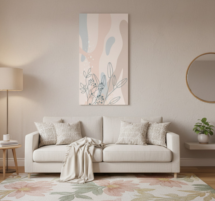 这个优雅的客厅配有一款时尚的米色沙发,沙发上装饰着图案靠垫,并搭配了一条舒适的毛毯。上方展示了一幅现代艺术作品,采用柔和的粉彩色调,融入了精致的花卉设计。一面圆形镜子和一盏灯增添了宁静的氛围,而绿色植物则为空间增添了一丝自然气息。
