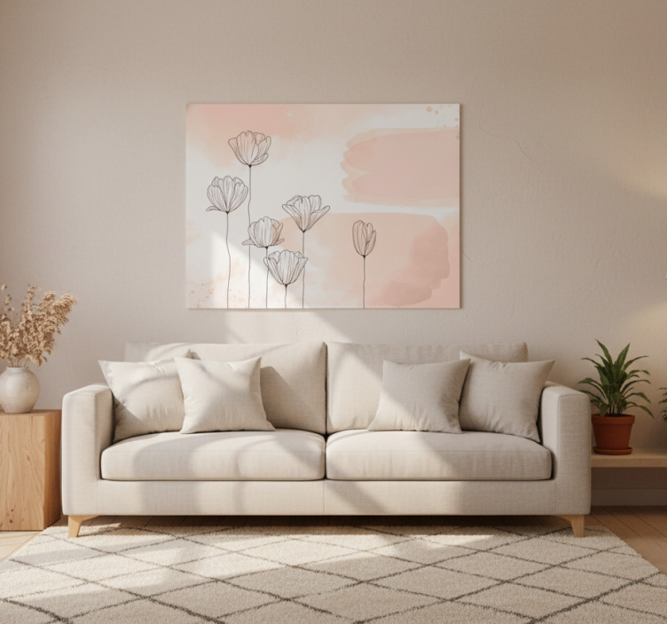 这幅图展示了一个宁静的生活空间,柔和色调的沙发上装饰着舒适的抱枕。沙发后面挂着一幅极简风格的花卉艺术作品,细腻的线条勾勒出花朵,背景是令人放松的柔和色调。一个盆栽植物和一个装饰性花瓶增添了自然元素,提升了房间的宁静氛围。