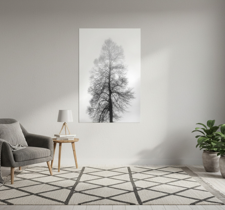 这幅图展示了一棵高挑、纤细的树,其复杂的枝干在柔和的雾气背景下形成了剪影。强烈的对比营造出一种令人难忘的美丽场景,唤起了宁静和反思的感觉。极简的美学增强了这种宁静,使其成为现代装饰的完美补充。