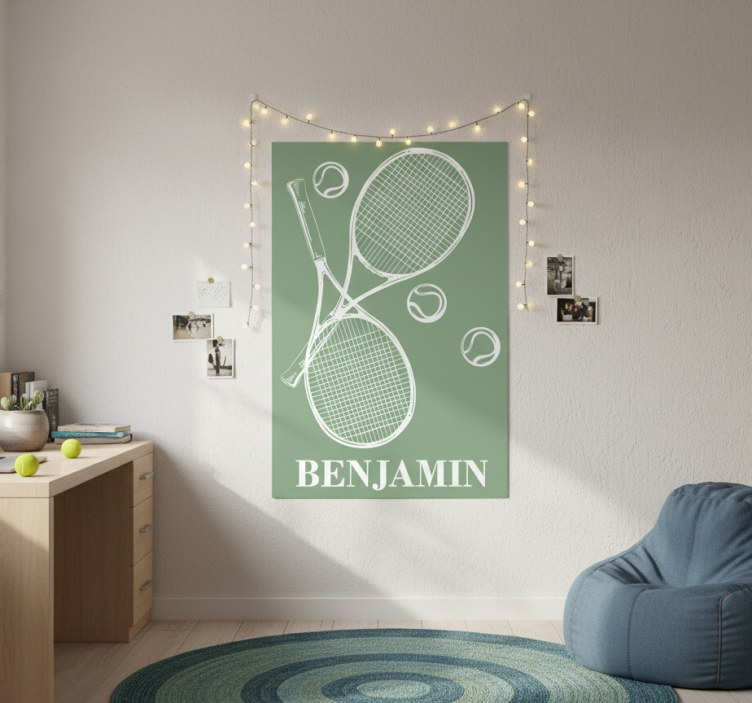 这幅图展示了一个时尚的设计,背景是浅绿色,两把网球拍交叉在一起。旁边有两个网球,增强了主题。插图下方,名字'BENJAMIN'以粗体字显著展示,为整体美感增添了个人风格。
