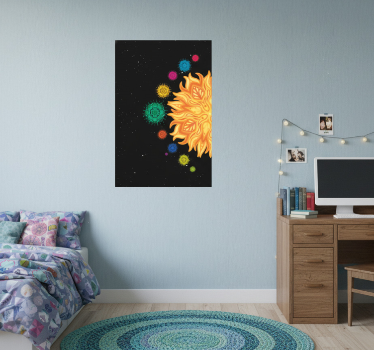 这幅生动的艺术作品展示了一轮引人注目的太阳,拥有复杂的图案,在深黑色的背景上散发出温暖。周围的天体以鲜艳的色彩漂浮,增强了宇宙主题。非常适合激发创造力和想象力,这件作品为任何空间带来了奇妙的感觉。