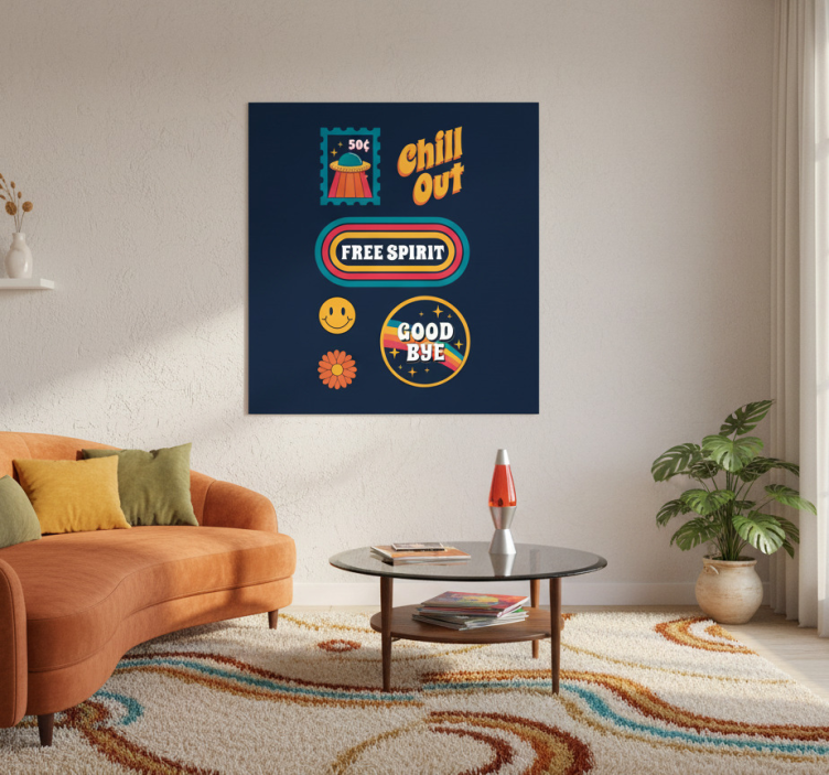 这幅图像展示了一幅生动的墙面艺术作品,展现了富有趣味的短语和插图。复古飞船、愉快的笑脸和五彩缤纷的花朵等图标增强了活泼的氛围。关键的信息包括 'Chill Out' 和 'Good Bye',营造出一种奇幻、自由奔放的氛围,非常适合轻松的室内环境。