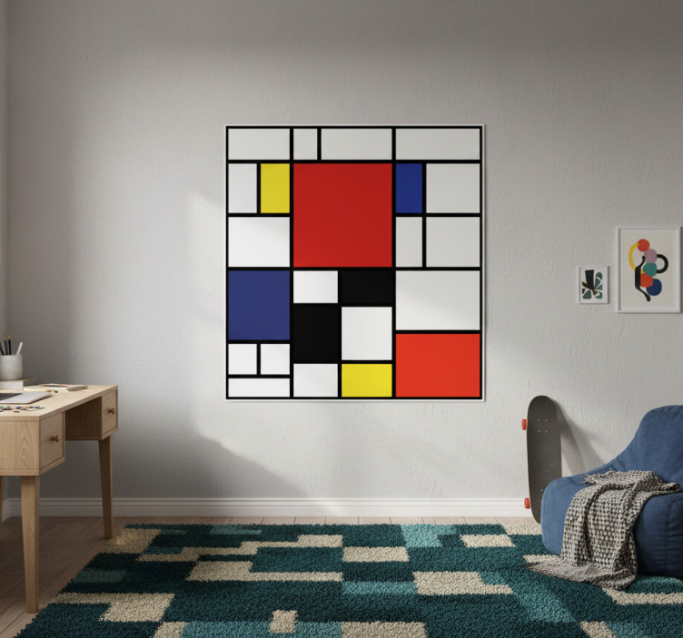 这幅图像展示了一个现代室内环境,突显出一幅由鲜艳的红色、蓝色、黄色和黑色块组成的抽象艺术作品。艺术品悬挂在一把舒适的蓝色椅子上,与现代美学相得益彰。一个极简的木桌和图案地毯提升了房间的时尚氛围。