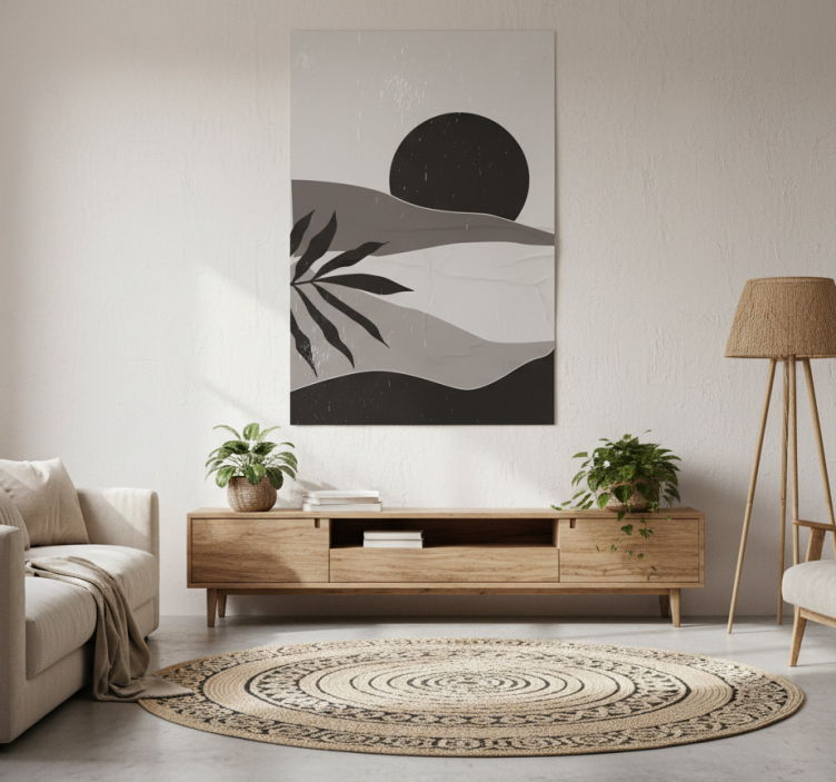 这个现代居住空间具有简约设计,墙上挂着一幅大型抽象画,描绘了宁静的风景。画作以大地色调为主,展现了一个大胆的太阳,映衬着柔和的山丘和细腻的植物。搭配自然木质家具和舒适的纺织品,整个房间散发着宁静与时尚的气息。