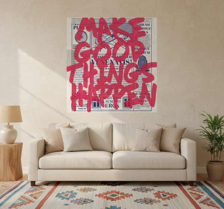 一个时尚的客厅里摆放着一款现代的米色沙发,上面装饰着一些靠垫。背景展示了一个生动的设计,中央有鼓舞人心的文字 'MAKE GOOD THINGS HAPPEN',用大胆的粉色字母书写。一盏质朴的木质台灯增添了温暖,而一块图案地毯则为这个宜人的氛围画上了句号。