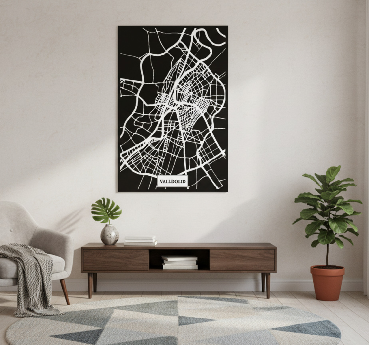 这幅图像展示了瓦拉多利德的引人注目的地图设计,精细的街道图案以鲜明的白色在深黑色背景上呈现。这种艺术表现捕捉了城市的复杂性,使其成为现代装饰的理想选择。极简风格增添了优雅,完美契合各种室内美学。