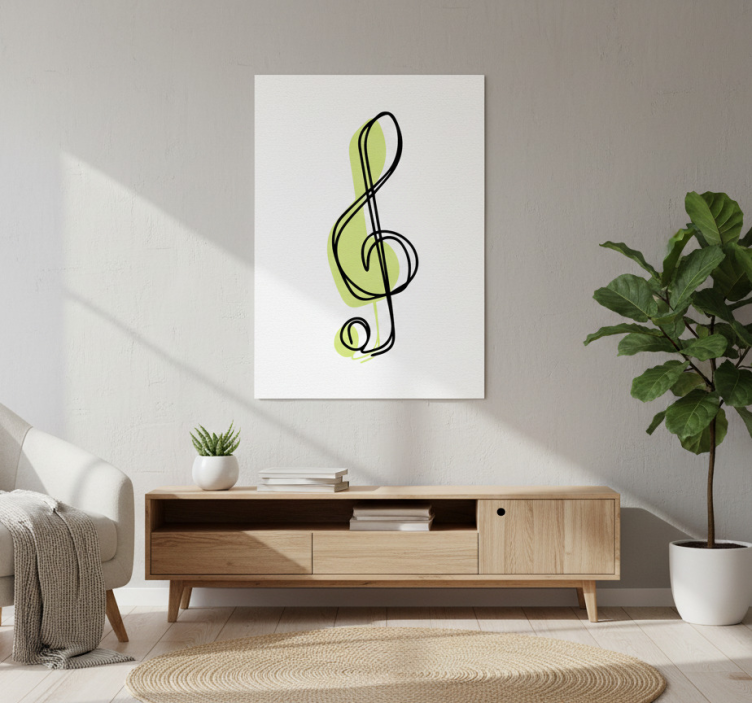 这幅图像展示了一个引人注目的极简音乐设计,突出了一只高音谱号。这个优雅的艺术作品将大胆的黑色线条与柔和的绿色背景相结合,增强了其吸引力。对于音乐爱好者来说,这件作品可以丰富任何现代空间,增添一种激发和谐与艺术表达的创意气息。