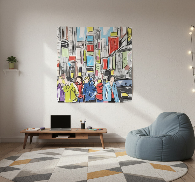 一个充满活力的城市景象描绘了一条繁忙的街道,街上人们穿着五彩斑斓的外套。摩天大楼在背景中高耸,装饰着明亮的广告。多样化的人群传达出一种生动的氛围,反映了现代城市生活。鲜艳的色彩和动态的艺术作品捕捉了运动和能量,邀请观众融入这个热闹的环境。