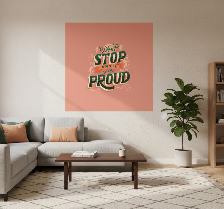 这幅引人注目的图像展示了一句鼓舞人心的名言,采用生动的排版。短语'Don't Stop Until You're Proud'在温暖的粉色背景上显著呈现。艺术性的装饰增强了设计感,而一个舒适的居住空间则配有柔软的沙发和装饰性植物,完美地衬托了整体美感。