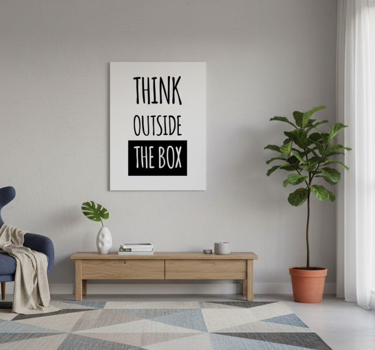 这幅图展示了一个现代简约的生活空间,里面有一把舒适的蓝色扶手椅、一张木制咖啡桌和一盆装饰植物。墙上显眼地挂着一幅励志海报,上面写着 'Think Outside the Box',背景是中性色调的墙面。地板上铺着一块时尚的几何图案地毯,增强了现代美感。