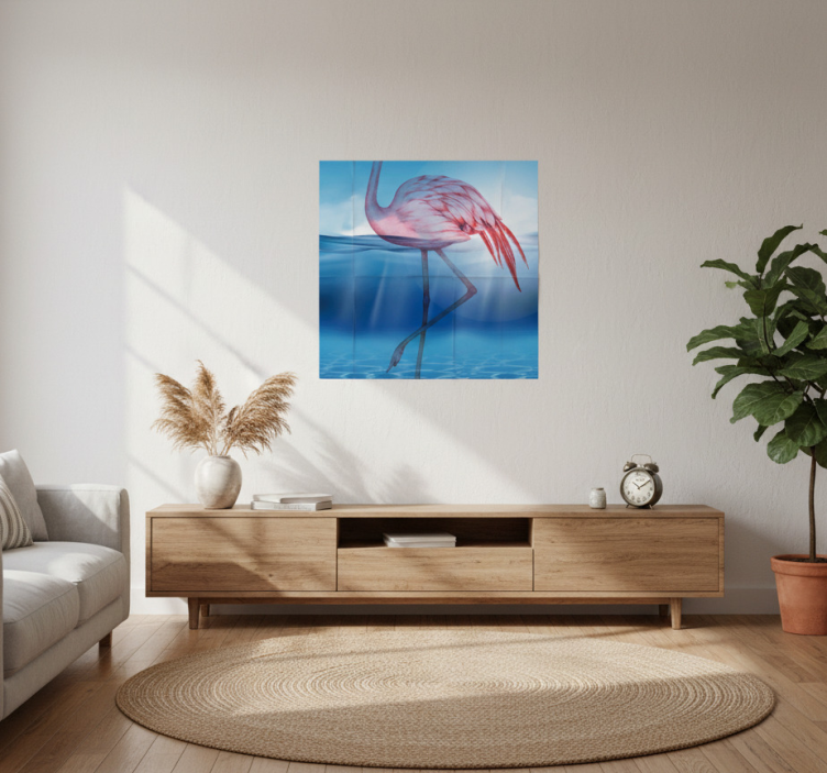 这幅引人入胜的艺术作品展示了一只优雅的火烈鸟,部分浸没在宁静的蓝色水中。它的粉色羽毛与鲜艳的绿松石色形成对比。柔和的光线反射增强了宁静的氛围,唤起一种平静和自然之美,非常适合现代装饰。
