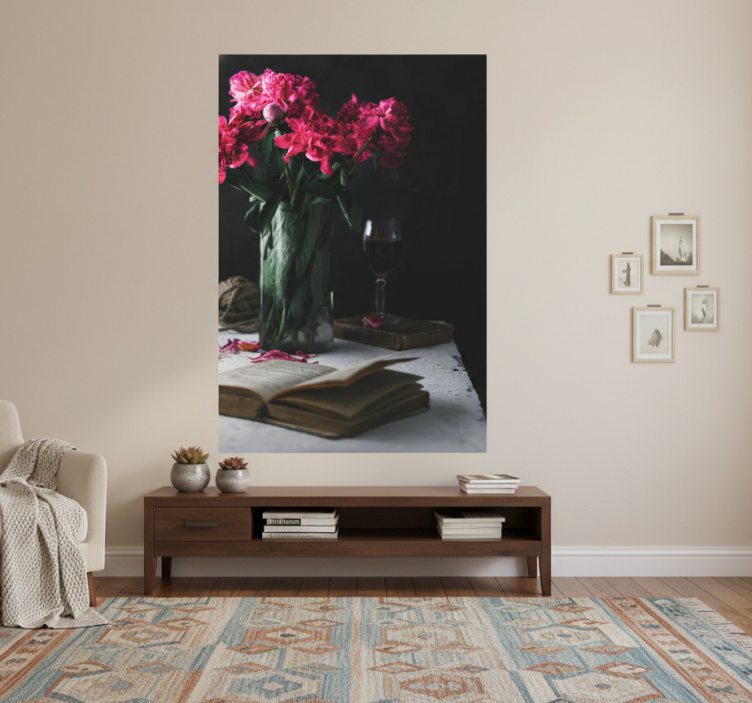 一幅迷人的静物画,生动的粉色花朵在玻璃花瓶中优雅地排列,放置在一个乡村风格的桌子上。旁边一本打开的书籍邀请阅读,伴随着一杯深色的葡萄酒。柔软的花瓣散落在周围,增强了这一宜人场景的宁静氛围。