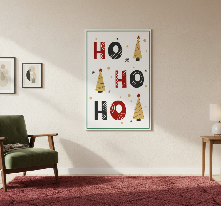 这幅节日艺术作品展示了“HO HO HO”这一短语的俏皮排列,周围环绕着风格化的圣诞树和欢快的图案。鲜艳的颜色,包括红色、金色和黑色,为节日氛围增添了快乐的气息。适合用来提升季节性装饰,这一设计体现了节日的精神和创意。