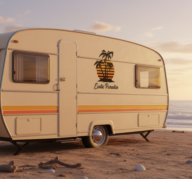 一辆复古的房车静静地停在沙滩上,散发着怀旧的魅力。设计中有棕榈树与绚丽的日落相映衬,并配有短语 'Exotic Paradise',唤起人们对热带度假所带来的渴望与放松感。