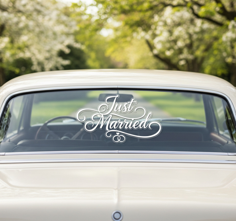 这件艺术作品为新婚夫妇精心设计,呈现了短语 'Just Married',并装饰有华丽的花纹和交织的戒指。它是一种庆祝的声明,常常展示在车辆上, encapsulating 了共同开始新生活的喜悦与兴奋。