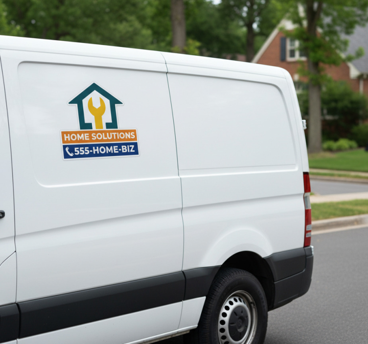 一个专业的品牌设计,采用房屋轮廓和扳手的图案,象征着家居改善服务。对“Home Solutions”的强调表明专注于为家庭项目提供帮助。联系信息鼓励潜在客户主动联系,突显了可及性和对客户服务的承诺。