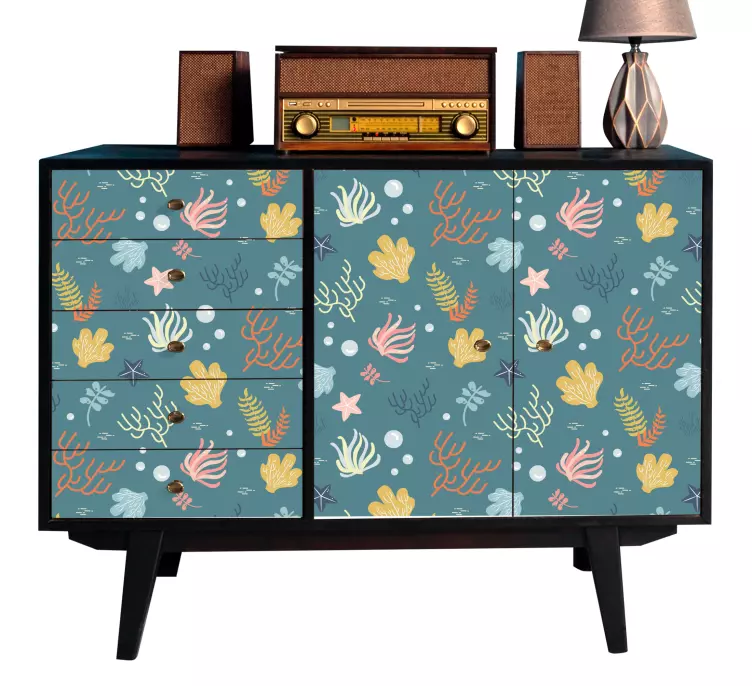 特色鲜明的海洋主题图案,展示了各种珊瑚、海星和水生植物。整体色彩清新,唤起了水下世界的感觉,为任何环境带来生动而富有趣味的氛围。